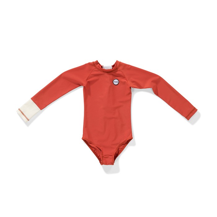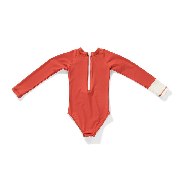 This is the Malie Sunny Peach long sleeve swimsuit for girls.
